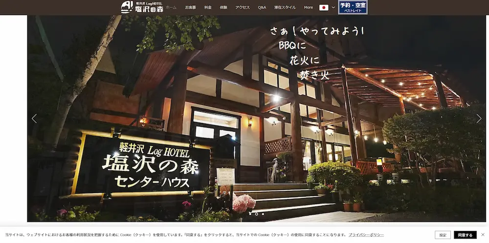 軽井沢ログHOTEL塩沢の森 緑豊かな森の中に建つログハウス風コテージ。BBQや花火も可能でファミリー層に人気。自然の中でゆったり過ごせる。 公式サイト