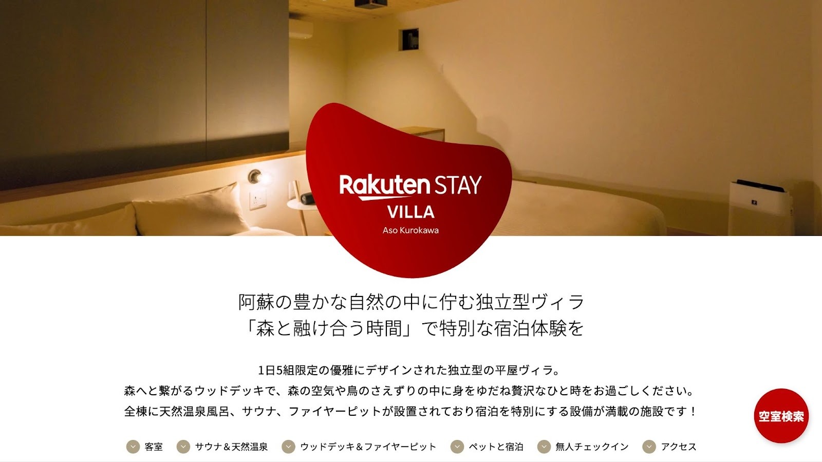 - 【熊本県】Rakuten STAY VILLA 阿蘇黒川|森の隠れ家でサウナや温泉を満喫